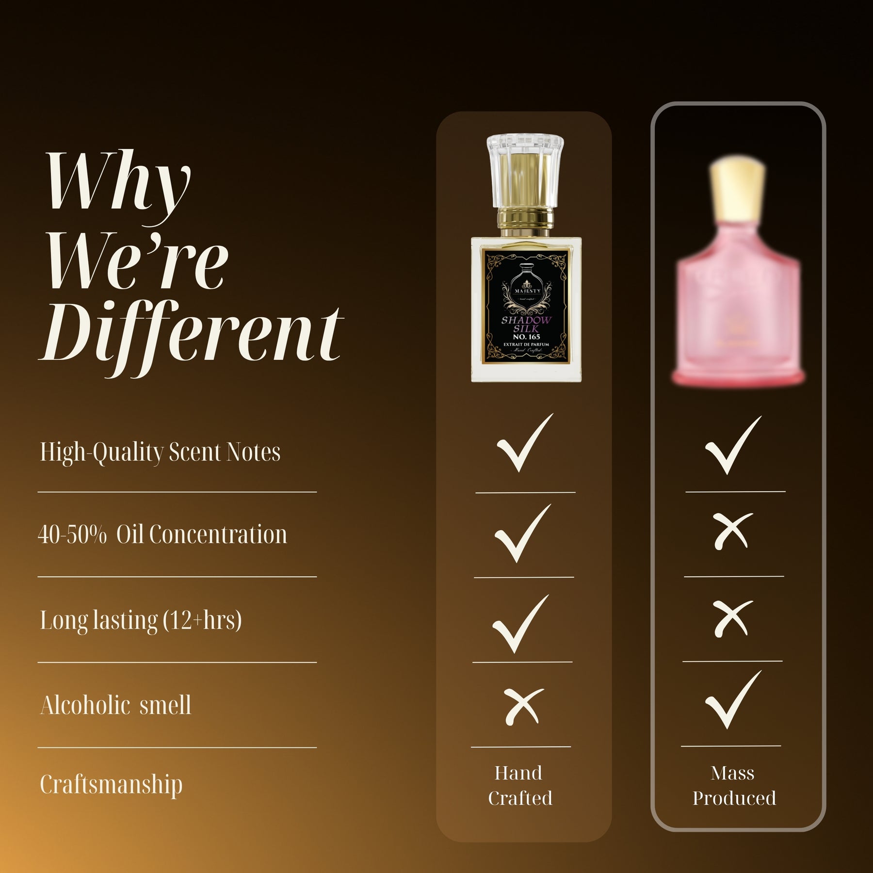 Each fragrance at Majesty's is made from scratch, a symphony of meticulously selected notes handcrafted with love and precision.