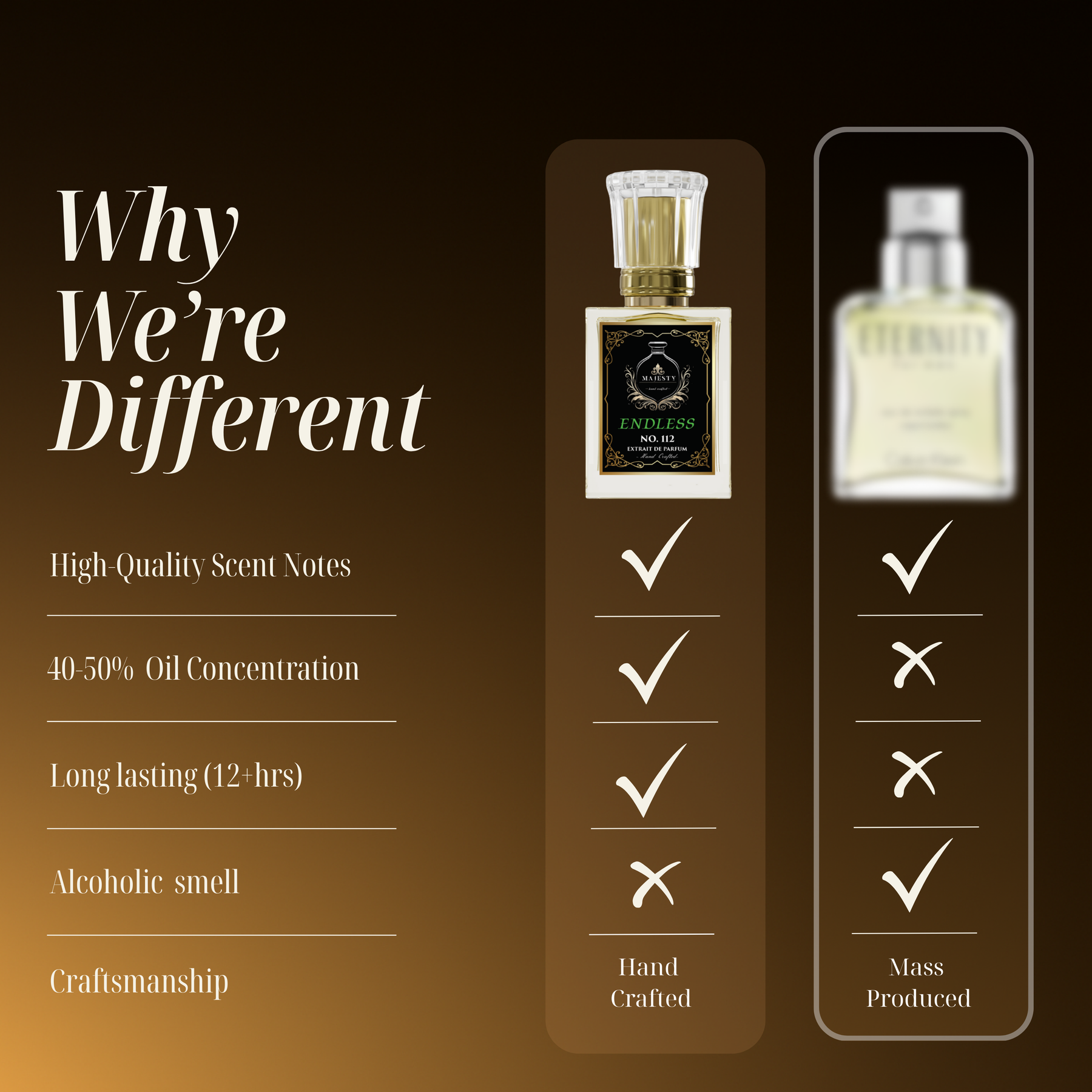 Each fragrance at Majesty's is made from scratch, a symphony of meticulously selected notes handcrafted with love and precision.